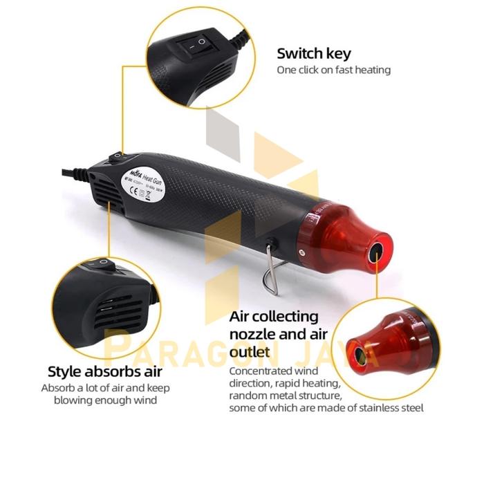Alat ini dirancang untuk memberikan aliran udara panas yang terkonsentrasi, menjadikannya sangat berguna untuk berbagai keperluan. Heat gun 300W sangat ideal untuk melekatkan vinyl (pemasangan stiker dan wrapping), melepas cat lama dengan cepat, membengkokkan pipa plastik, menyusutkan heat shrink tube, melonggarkan mur dan baut yang berkarat, hingga mencairkan lem perekat. Desainnya yang ergonomis dan ringan memastikan kenyamanan selama penggunaan, sementara tombol on/off yang mudah diakses meningkatkan keselamatan pengguna.