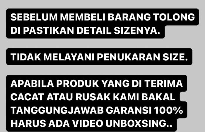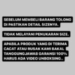 - Ukuran: Pastikan memilih size sesuai kebutuhan. Cantumkan di catatan order atau chat admin.
