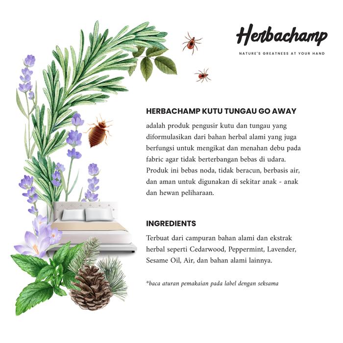 Lindungi rumah Anda dari kutu dan tungau dengan solusi alami yang efektif dan aman. Herbachamp Kutu Tungau Go Away diformulasikan khusus dari ekstrak tumbuhan pilihan untuk mengusir hama secara alami tanpa membahayakan keluarga tercinta. Selain mengusir kutu, produk ini juga berfungsi mengikat dan menahan debu pada permukaan kain, mencegahnya beterbangan di udara sehingga udara di rumah lebih bersih dan sehat. Aman digunakan di sekitar anak-anak dan hewan peliharaan.