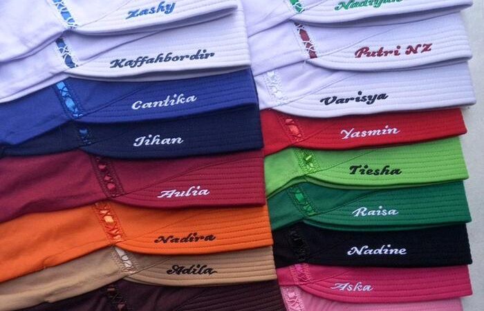 - Bordir: Teknik penyulaman benang untuk membentuk pola atau tulisan pada kain, tahan lama dan rapi.