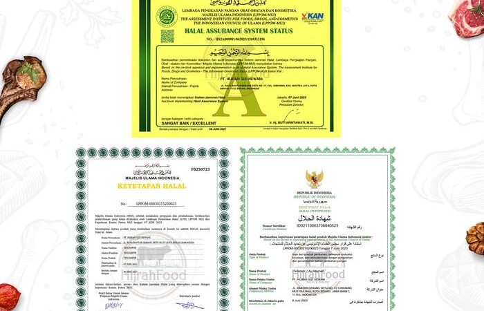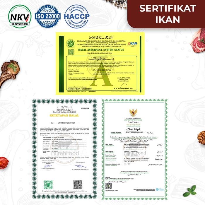 | Sertifikasi | Halal MUI, NKV (Nomor Kontrol Veteriner), dan ISO 22000:2018 untuk jaminan keamanan pangan (food safety). |