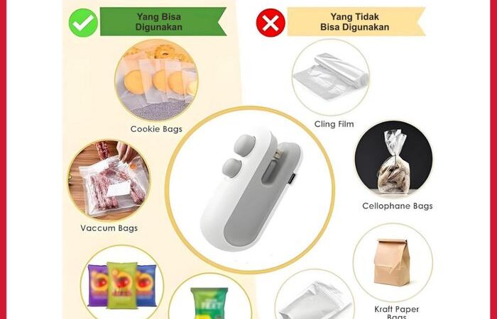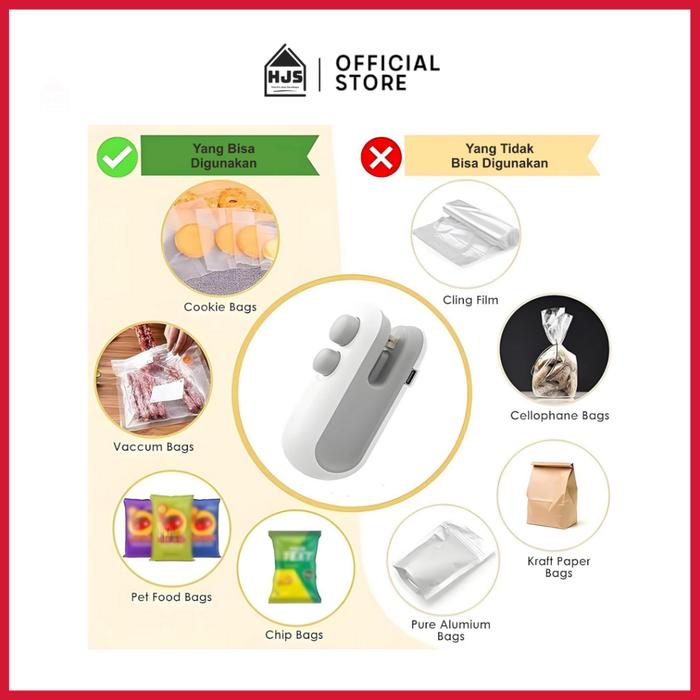 | Kompatibilitas | Cocok untuk berbagai kantong plastik biasa, film poliester, dan kemasan snack. Tidak untuk cling film atau kemasan aluminium. |