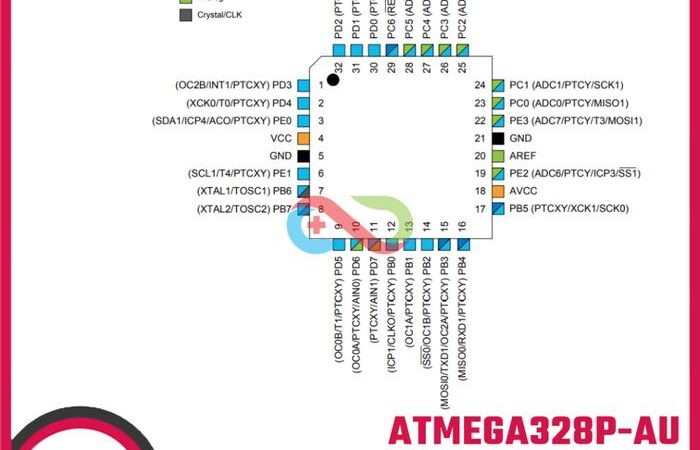 • TQFP-32 (Thin Quad Flat Package): Salah satu jenis kemasan (package) untuk chip IC yang berbentuk persegi dan memiliki kaki (pin) yang keluar ke empat sisinya. Angka 32 menunjukkan jumlah kaki yang dimiliki.
