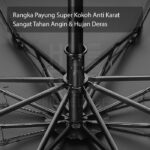- UPF 50+: Nilai Ultraviolet Protection Factor (UPF) menunjukkan kemampuan bahan memblokir sinar UV. UPF 50+ berarti hanya 1/50 sinar UV yang menembus payung.