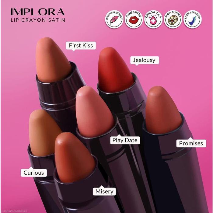 Raih tampilan bibir yang memukau dengan kelembutan satin dan perawatan intensif dari Implora Lip Crayon Satin. Formula inovasinya diperkaya dengan Omega Complex (3, 6, 9) dan Shea Butter yang bekerja sinergis menjaga kelembaban alami, mencegah bibir kering, dan memberikan sensasi nyaman sepanjang hari. Hasilnya adalah warna creamy dengan finish satin elegan yang pigmented dan tahan lama.