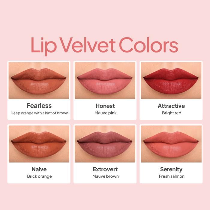 - Hasil Akhir Velvet: Finish matte yang terasa halus dan lembut seperti beludru pada bibir.