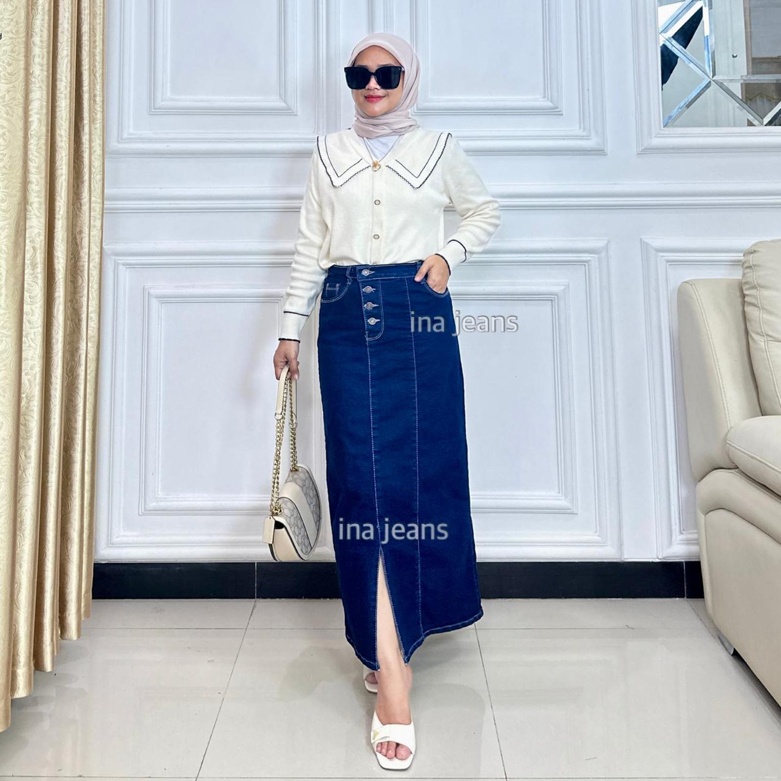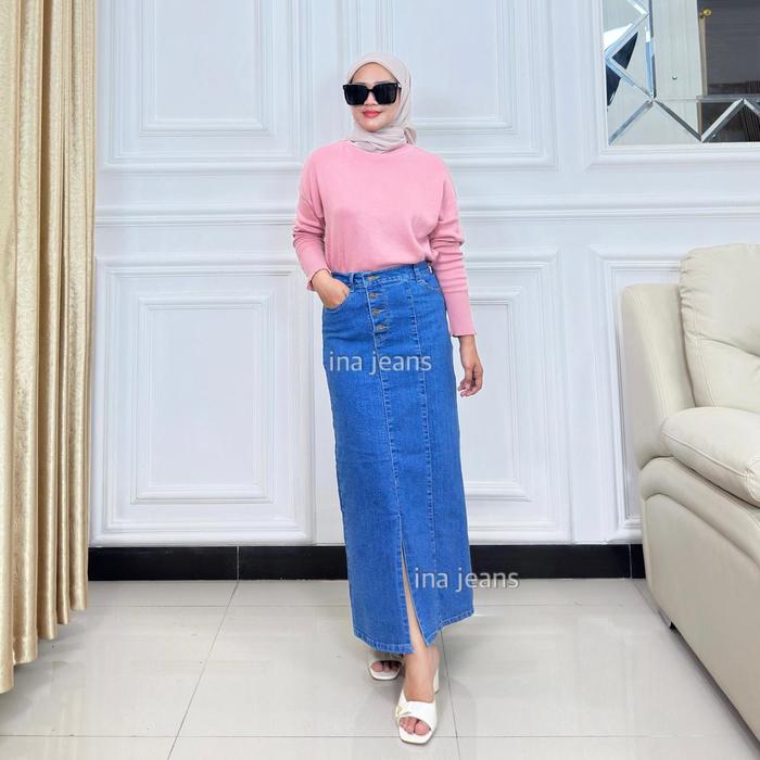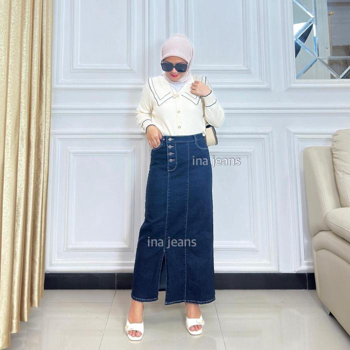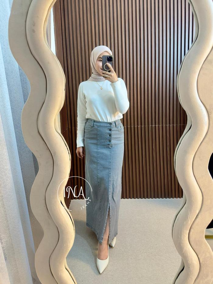 Tampil percaya diri dengan Long Doremi Skirt dari Ina Jeans. Rok jeans panjang ini didesain semi A-line yang sempurna menutupi tubuh dan memberikan siluet yang anggun. Dibuat dari bahan denim premium berkualitas tinggi dengan campuran stretch, sehingga sangat lentur dan nyaman digunakan seharian. Desainnya yang stylish dilengkapi kancing di bagian depan dan pinggang belakang berelastis untuk kenyamanan maksimal.