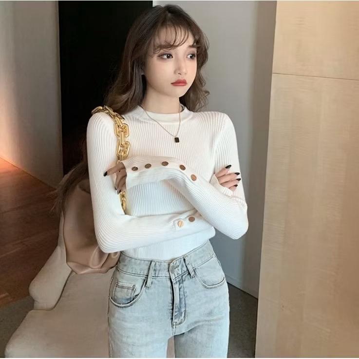 | Desain | Kerah bulat (crew neck), lengan panjang, polos, dan dilengkapi kancing depan. |