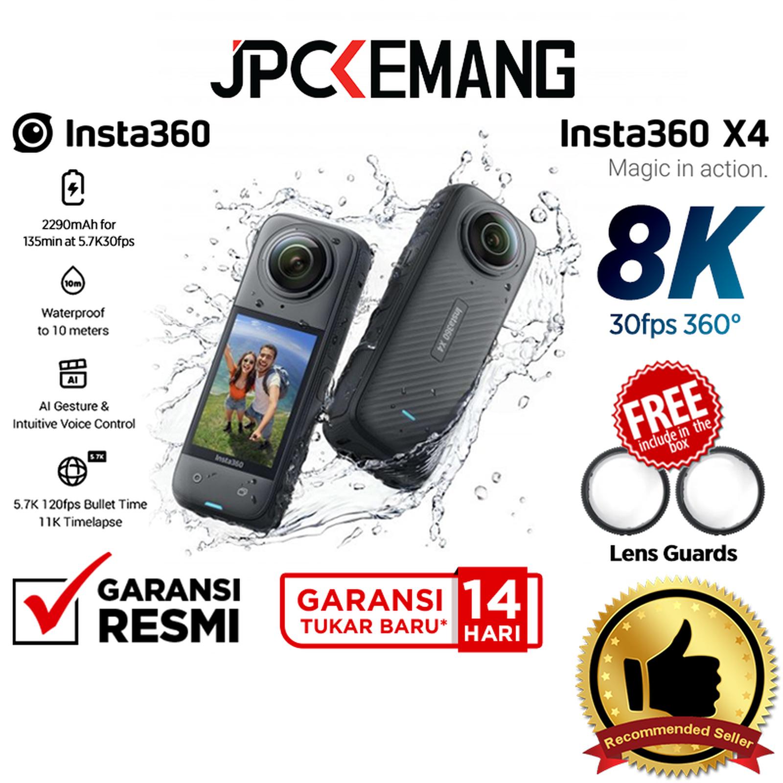 Setiap unit kamera sudah termasuk: 1x Insta360 X4 Camera, 1x Standard Lens Guards, 1x Battery, 1x Charging Cable, 1x Protective Pouch, 1x Lens Cloth, 1x Thermo Grip Cover.
