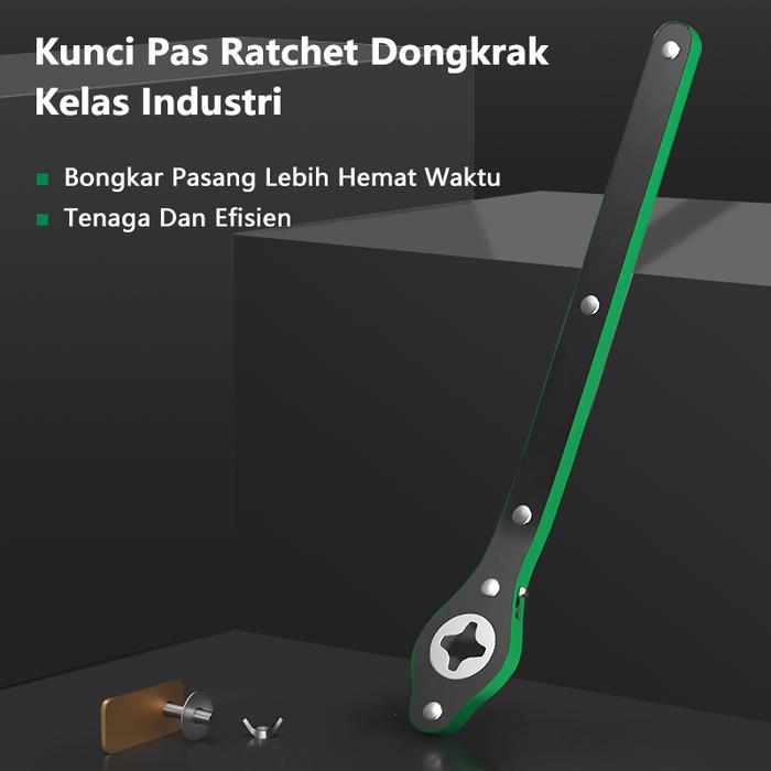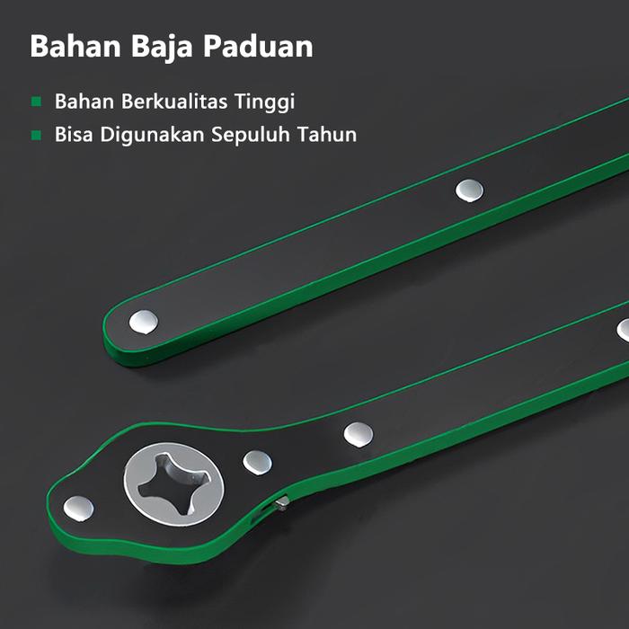 | Fitur Utama | Mekanisme ratchet maju & mundur, Desain ergonomis, Tahan karat, Torsi tinggi, Batang melengkung anti cedera, Adaptor universal |