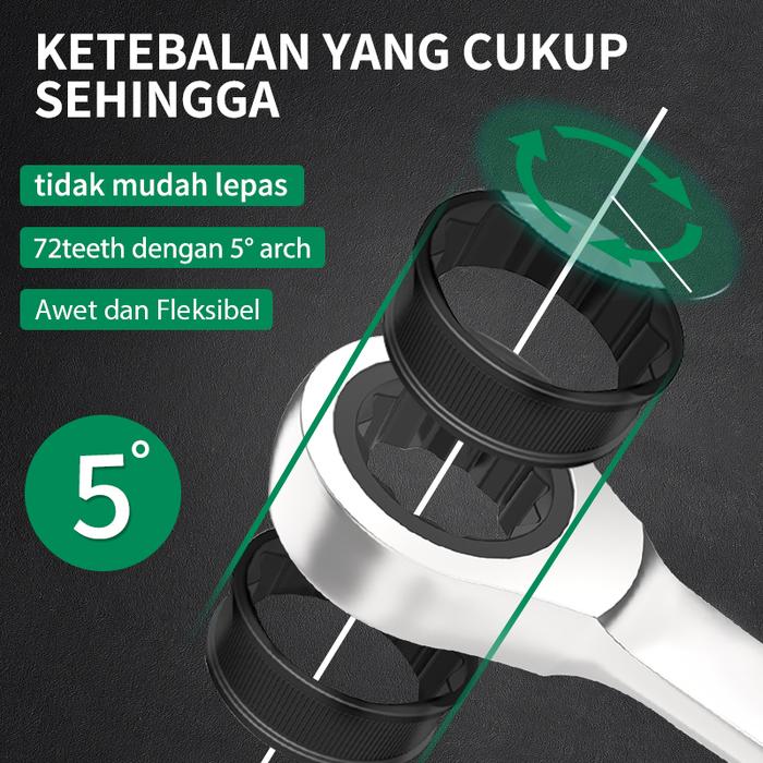 | Mekanisme Ratchet 72 Gigi | Sudut putar hanya 5 derajat, memungkinkan kerja cepat di ruang sempit tanpa perlu melepas dan memasang kembali kunci secara berulang. |