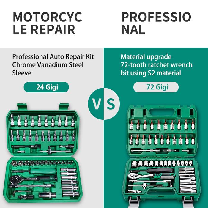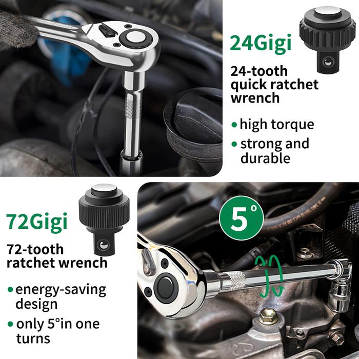 - Ratchet 72 Gigi: Mekanisme pada gagang ratchet yang memungkinkan pemutarannya hanya membutuhkan sudut putar yang sangat kecil (hanya 5 derajat) untuk mengunci dan memutar soket. Ini sangat memudahkan pekerjaan di ruang yang terbatas.