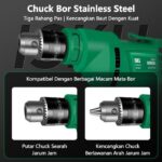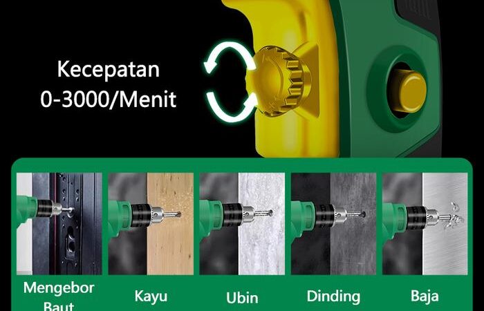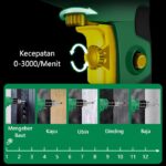 | Kecepatan Tinggi 3000 RPM | Kecepatan variabel (stepless) dari 0 hingga 3000 RPM, memberikan fleksibilitas untuk material lunak maupun keras. |