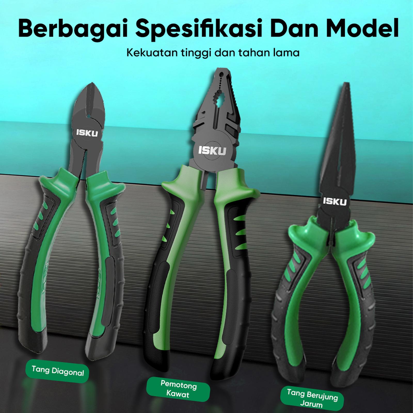 Tang Kombinasi ISKU hadir sebagai alat terpercaya untuk berbagai kebutuhan: menjepit, memotong, membengkokkan, mematahkan, hingga mengiris. Tersedia dalam ukuran 6 dan 8 inch untuk memberikan pilihan yang sesuai dengan genggaman dan kebutuhan pekerjaan Anda.