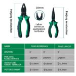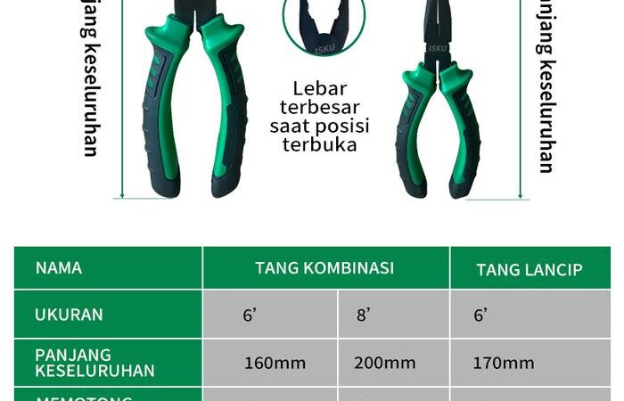 | Tiap Tang (Kombinasi, Lancip, Potong) | – Kekerasan (HRC): 56-62 – Daya Potong: Baja ≤1.8mm, Besi ≤2.8mm, Tembaga ≤4mm – Fitur: Pegangan ergonomis, tahan lama | – Masing-masing memiliki fungsi spesialisasi untuk efisiensi kerja maksimal |