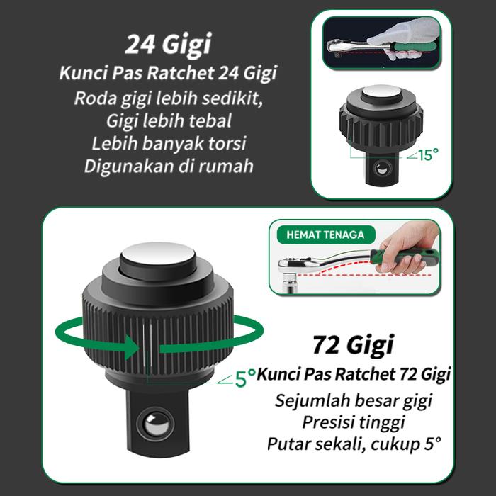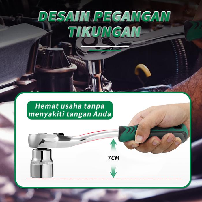 | Kunci Rachet & Handle | 2 pcs | Drive: 1/2″ & 1/4″. Dilengkapi mekanisme ratchet untuk pekerjaan cepat tanpa melepas tool. |