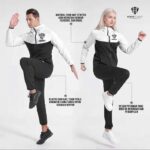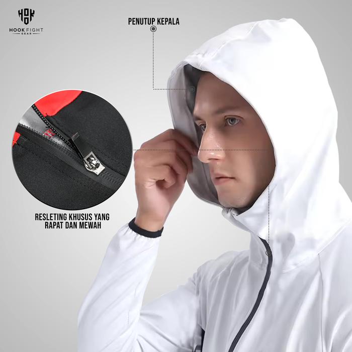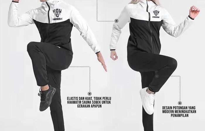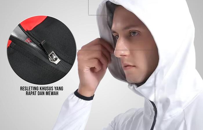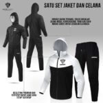 Desainnya sporty dan modern, tersedia dalam set lengkap (jaket dan celana) dengan ritsleting hingga leher serta penutup kepala. Fitur karet elastis di pinggang, lengan, dan kaki memberikan kenyamanan ekstra selama berolahraga. Cepat kering dan tahan lama, cocok untuk pria dan wanita.