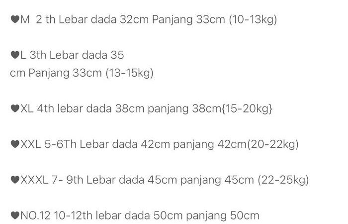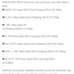 | Ukuran | Lebar Dada (cm) | Panjang (cm) | Perkiraan Usia | Berat Anak (kg) |