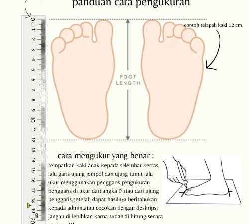 Ukur panjang telapak kaki anak dari ujung tumit hingga ujung jari terpanjang menggunakan penggaris atau meteran kain (bukan meteran bangunan). Beri jarak 0,5 – 1 cm untuk kenyamanan. Contoh: Jika panjang telapak kaki 13 cm, pilih ukuran 24 dengan insole 14 cm.
