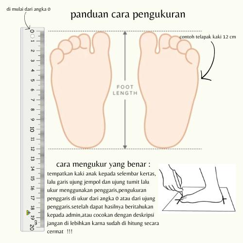 Ukur panjang telapak kaki anak dari ujung tumit hingga ujung jari terpanjang menggunakan penggaris atau meteran kain (bukan meteran bangunan). Beri jarak 0,5 – 1 cm untuk kenyamanan. Contoh: Jika panjang telapak kaki 13 cm, pilih ukuran 24 dengan insole 14 cm.