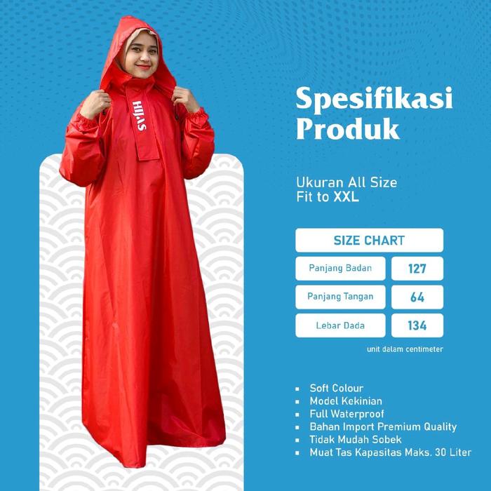 Bingung saat hujan tiba-tiba turun saat bermotor? Jas hujan biasa terlalu ribet dan tidak syar’i? Kini hadir Jas Hujan Gamis Muslimah dengan desain khusus untuk Hijabers! Tanpa perlu celana tambahan, langsung pakai seperti gamis biasa. Desainnya simpel (tersedia model zipper dan non-zipper), lebar di bagian bawah, dan bisa dilipat masuk ke tas 30 liter. Cocok untuk aktivitas outdoor tanpa khawatir basah atau kurang fashionable!