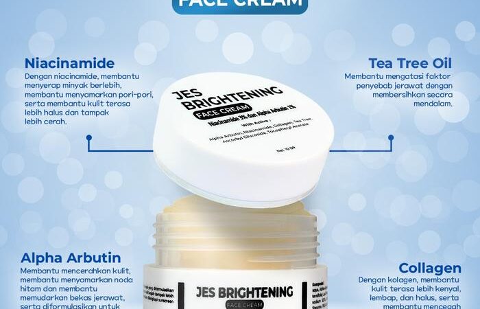 | Jes Brightening Face Cream | Menutrisi kulit agar sehat, lembut, dan cerah. Menyamarkan noda hitam serta bekas jerawat. Cocok untuk semua jenis kulit. | Gunakan secara teratur sebagai pelembap sehari-hari untuk menjaga kesehatan dan kelembapan kulit. |