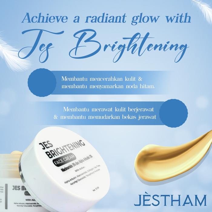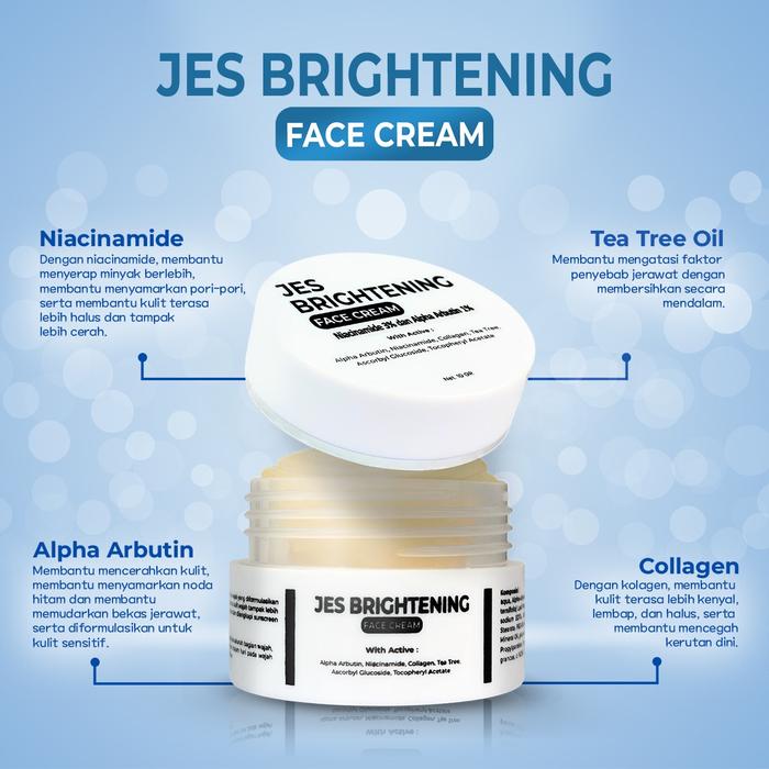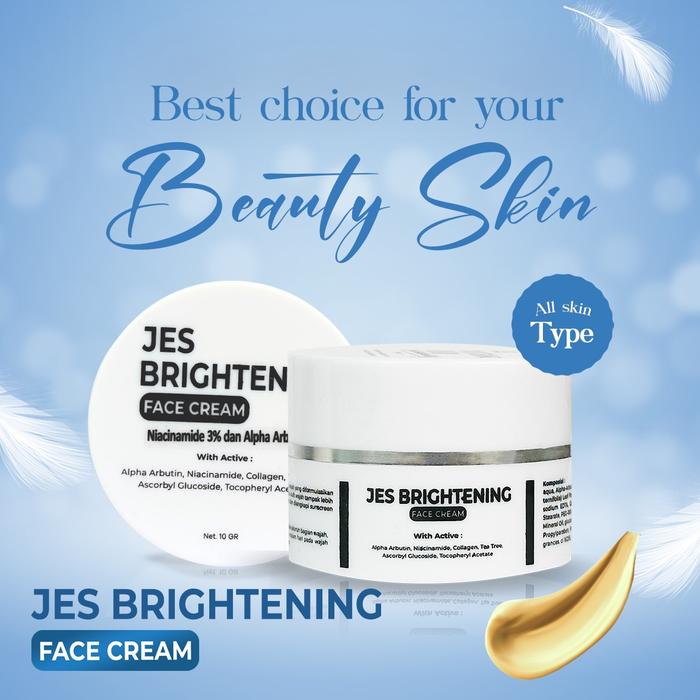 | Jes Brightening Face Cream | Menutrisi kulit agar sehat, lembut, dan cerah. Menyamarkan noda hitam serta bekas jerawat. Cocok untuk semua jenis kulit. | Gunakan secara teratur sebagai pelembap sehari-hari untuk menjaga kesehatan dan kelembapan kulit. |