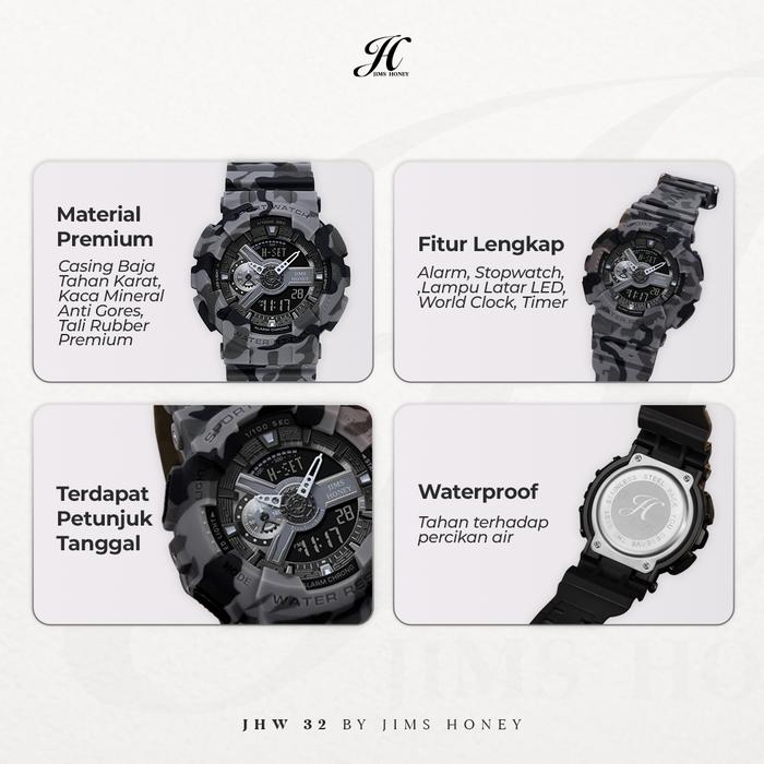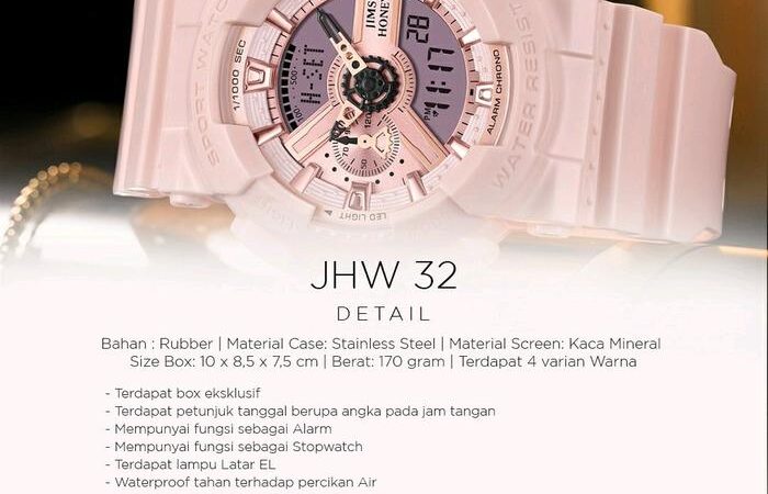 Tampil beda dengan Jims Honey JHW 32! Jam tangan couple sporty ini dirancang untuk mendukung gaya hidup aktif dan penuh gaya. Dilengkapi dengan fitur-fitur canggih seperti Stopwatch untuk mencatat waktu dengan akurat, Jam Dunia untuk melacak zona waktu berbeda, Alarm yang praktis, dan lampu LED untuk visibilitas sempurna di kondisi gelap. Dengan ketahanan air hingga 5 ATM, jam ini tak takut terkena percikan air atau hujan, cocok untuk aktivitas sehari-hari.