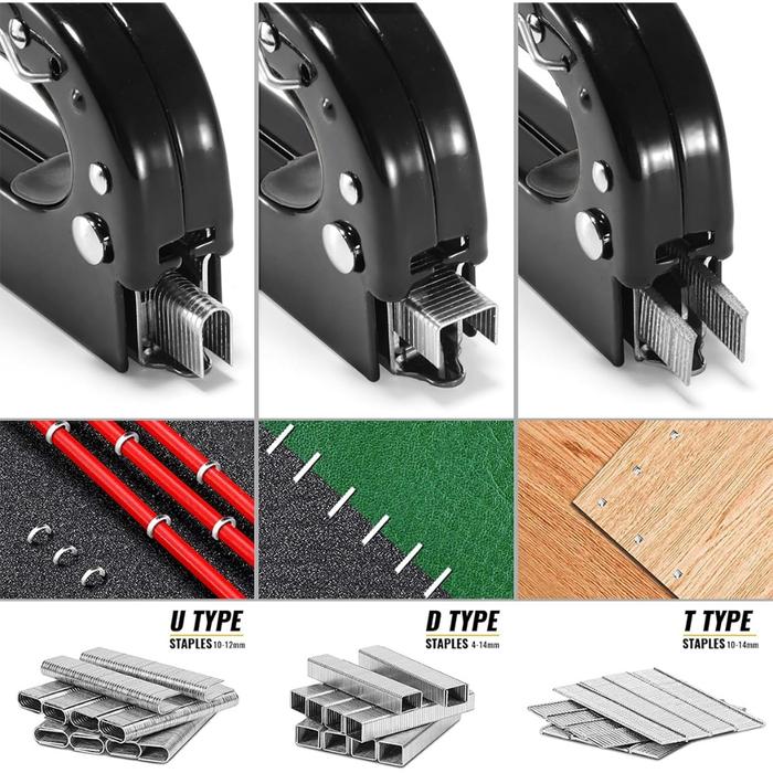 | Aplikasi 3-in-1 | Kompatibel dengan staples tipe D, U, dan paku Brad tipe T (model T50, T18). |