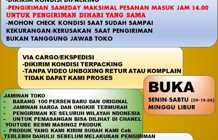 - Produk telah dicek sebelum dikirim, komponen lengkap dan berfungsi baik. Kerusakan/kekurangan/keterlambatan pengiriman di luar tanggung jawab kami.