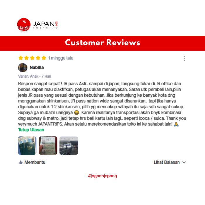 Nikmati kemudahan menjelajahi Jepang dengan JR Pass Nation Wide! Dengan satu tiket, Anda dapat mengakses hampir seluruh jaringan transportasi JR di seluruh negeri. Tiket ini berlaku untuk Shinkansen (kereta peluru), JR Bus, Tokyo Monorail, JR Ferry, Limited Express, serta kereta Haruka dan Narita Express (N’EX).