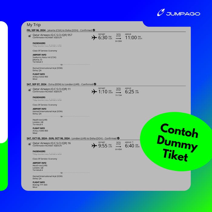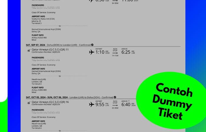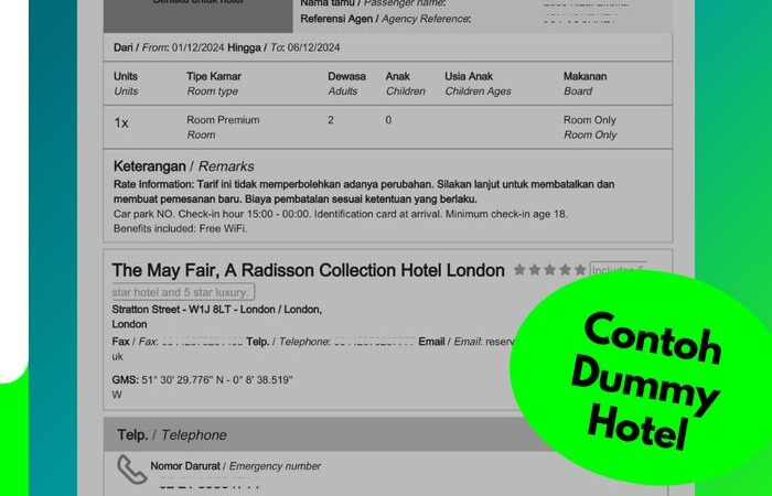- Dummy Tiket/Hotel: Dokumen simulasi yang menyerupai tiket pesawat atau reservasi hotel asli. Digunakan primarily untuk keperluan administratif seperti pengajuan visa, dimana calon traveler diwajibkan menunjukkan bukti rencana perjalanan dan akomodasi, namun belum dapat atau belum ingin melakukan pemesanan yang sesungguhnya.