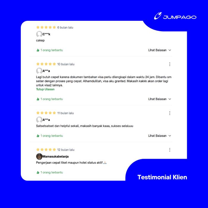 Dapatkan Dummy Tiket Sekali Jalan Internasional yang aktif dan valid untuk memenuhi syarat dokumen perjalanan Anda. Solusi praktis dan terjangkau dari JumpaGo, tanpa biaya ekstra untuk pengurusan visa atau aplikasi imigrasi.