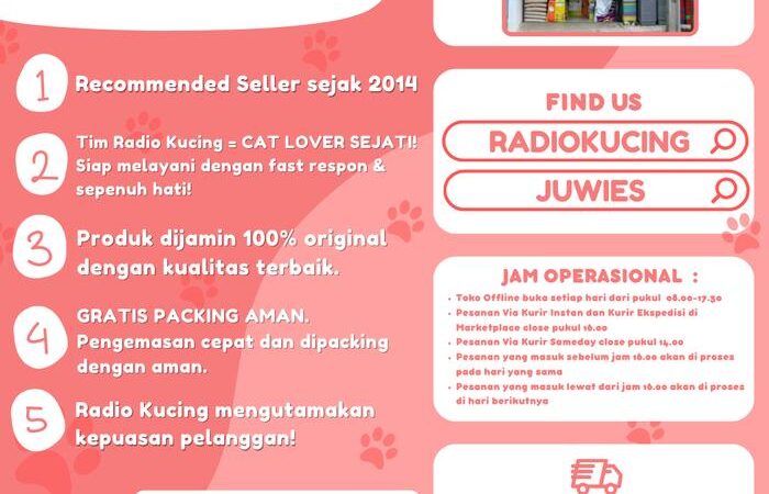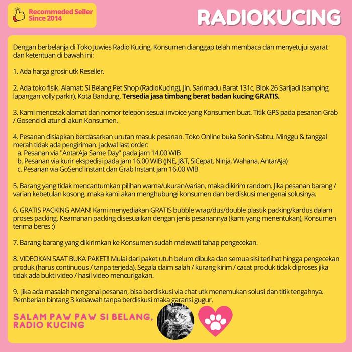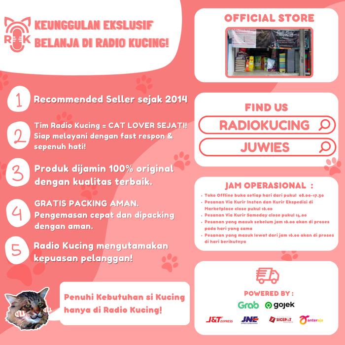 Dapatkan produk asli hanya di Radio Kucing! Kami menyediakan segala kebutuhan hewan peliharaan Anda, mulai dari makanan, aksesoris, obat-obatan, hingga perlengkapan grooming.