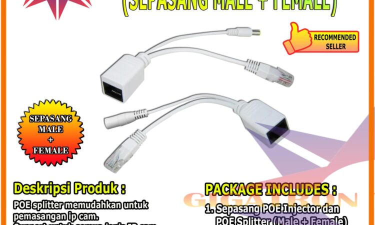 | Dapatkan satu set lengkap berisi POE Injector dan POE Splitter (Male & Female) untuk satu instalasi penuh. | Kemasan: Sepasang (Injector + Splitter) |