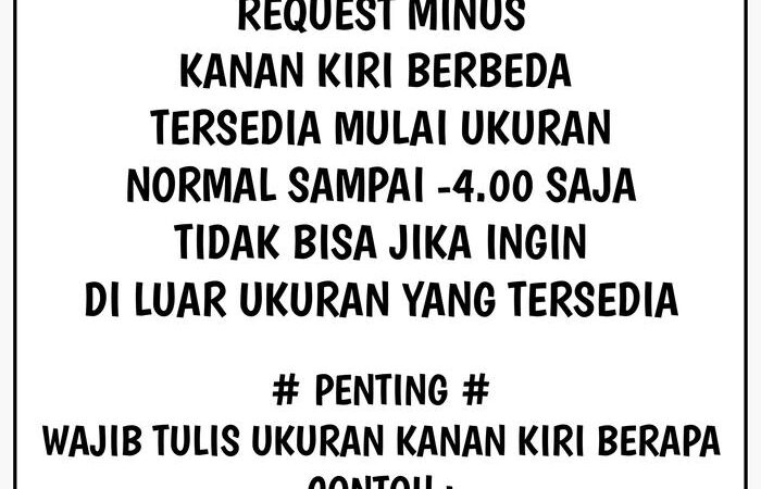 Pastikan untuk menuliskan detail minus mata kanan dan kiri pada kolom pesan saat checkout. Contoh: “Minus kanan -1.50, kiri -2.00”. Jika tidak dicantumkan, kami akan mengirimkan kacamata dengan lensa normal (0.00).