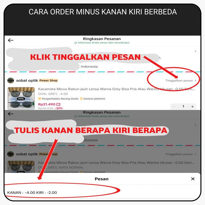 Pastikan untuk menuliskan detail minus mata kanan dan kiri pada kolom pesan saat checkout. Contoh: “Minus kanan -1.50, kiri -2.00”. Jika tidak dicantumkan, kami akan mengirimkan kacamata dengan lensa normal (0.00).