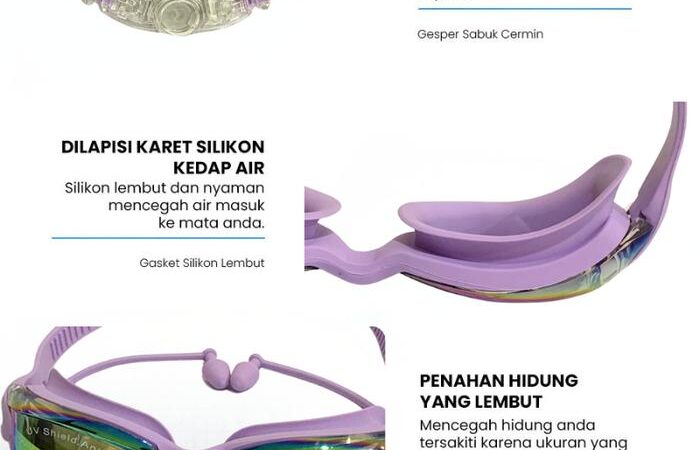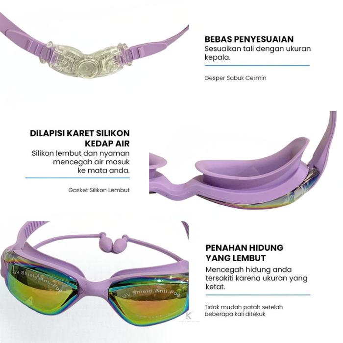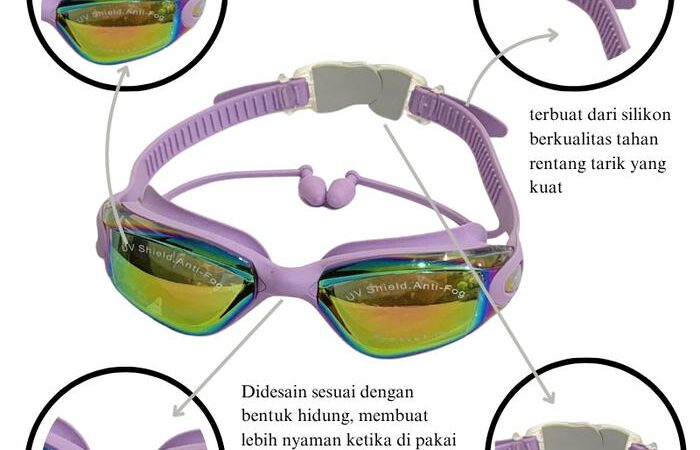 - Anti Fog: Lapisan khusus pada lensa yang mencegah terjadinya pengembunan (kabut) di bagian dalam kacamata akibat perbedaan suhu antara air dan tubuh, sehingga pandangan tetap jelas.