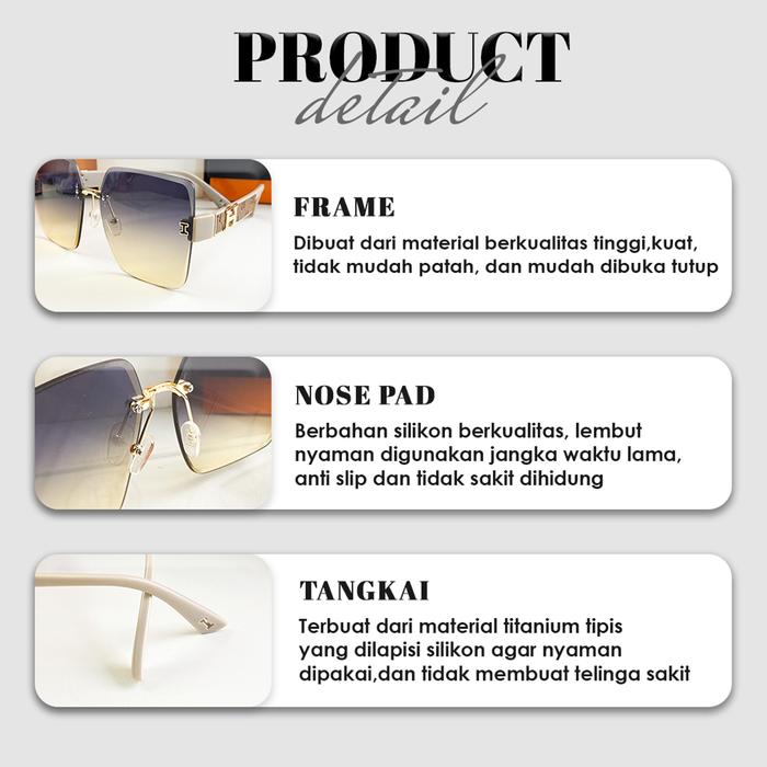 | Desain | Tanpa bingkai (Rimless), cocok untuk bentuk wajah kecil, tampil lebih cantik dan sophisticated. |
