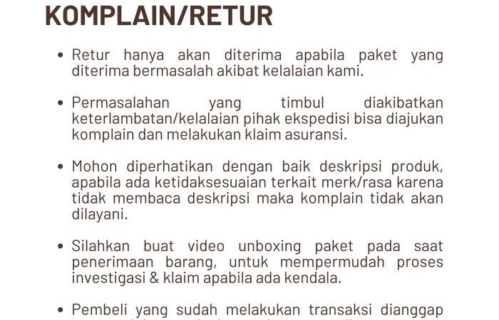 | Garansi Pengiriman | Garansi ganti produk jika kemasan rusak selama pengiriman. |