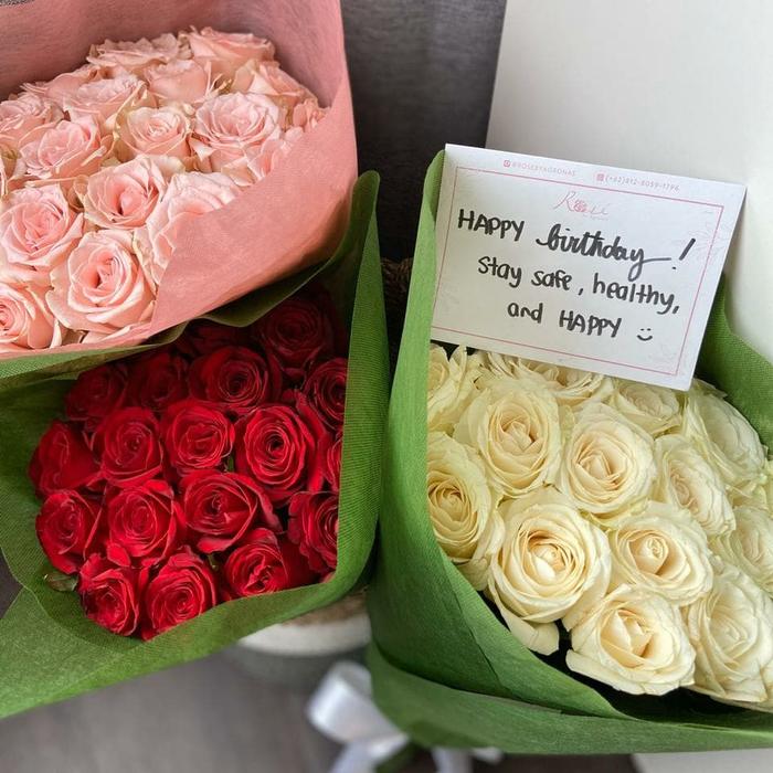 | Isi Buket | 20 tangkai mawar (1 warna) Opsional: 40 tangkai (2 warna) dengan menambah 2 produk di keranjang |