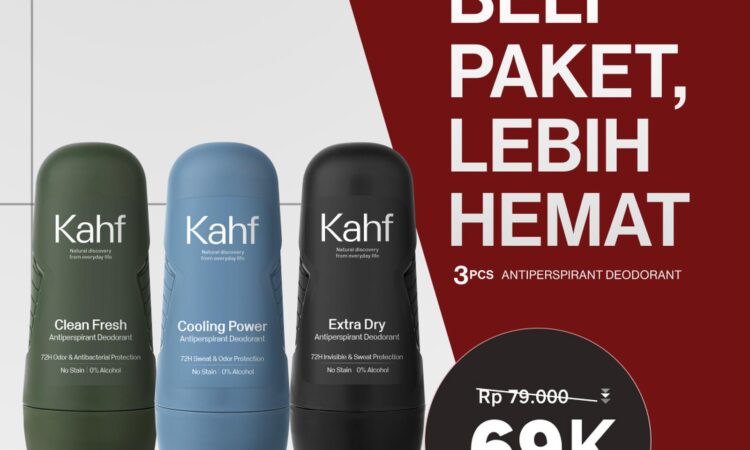 Dapatkan perlindungan maksimal dengan Kahf Bundle 3in1, paket deodorant roll on antiperspirant pertama di Indonesia yang menggunakan Nature Charged Formula. Produk ini dirancang khusus untuk melawan tiga jenis keringat (akibat stres, panas, dan aktivitas) serta menghilangkan bau badan tanpa menyebabkan iritasi. Dilengkapi dengan SmartSync Deo Care Technology, Kahf Antiperspirant Deodorant memberikan kesegaran signature aroma sepanjang hari dan perlindungan hingga 72 jam.
