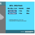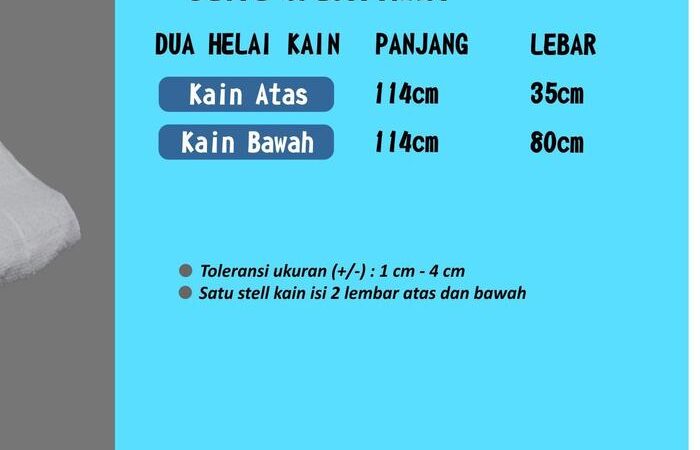 | Ukuran Detail & Jelas | Satu set terdiri dari 2 lembar: atasan (110 cm x 35 cm) dan bawahan (110 cm x 65 cm). Toleransi ukuran +/- 3-6 cm. Berat per set sekitar 350 gram. |
