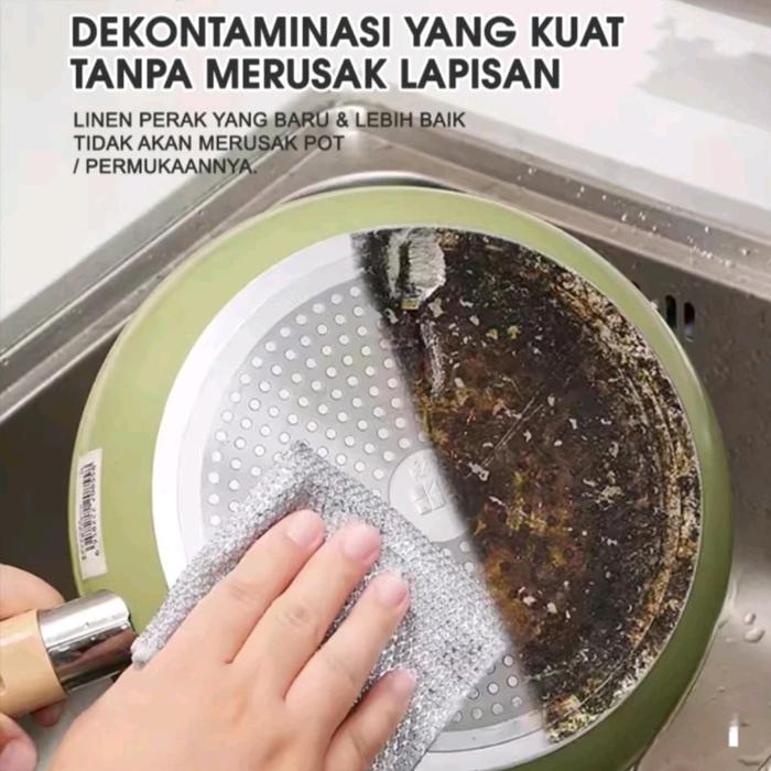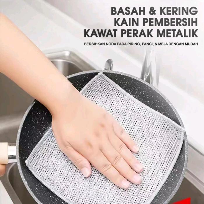 Kain lap dapur kawat perak ini dirancang khusus untuk membersihkan peralatan masak seperti panci, wajan, piring, dan perangkat dapur lainnya dengan cepat dan efisien. Terbuat dari bahan kawat berkualitas tinggi, kain lap ini tidak mudah rontok dan tahan lama. Teksturnya halus saat terkena air dan busa, sehingga aman untuk permukaan peralatan tanpa meninggalkan goresan.