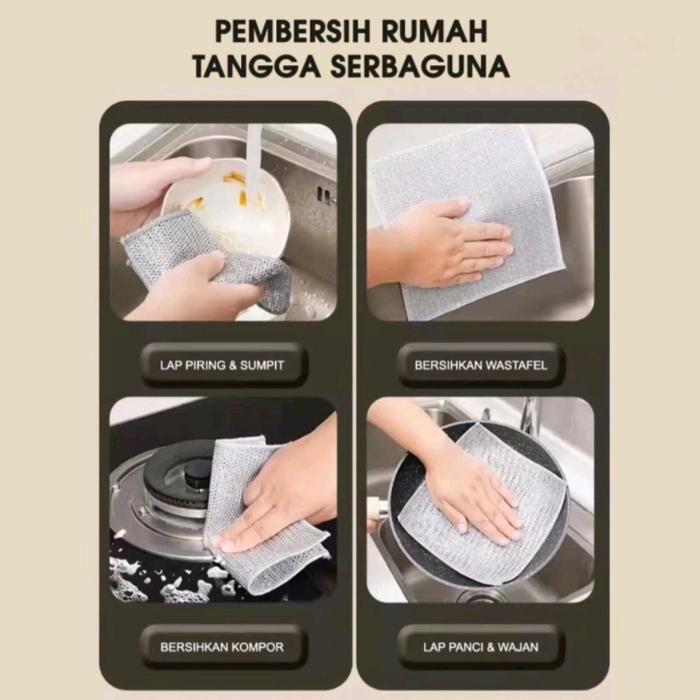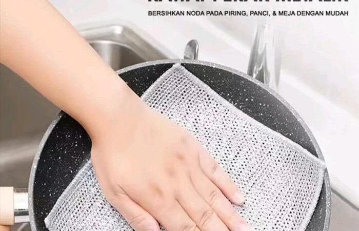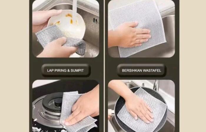 - Kain Lap Kawat: Material lap berbahan dasar kawat halus yang dirancang untuk mengikis noda atau kerak tanpa merusak permukaan peralatan dapur.
