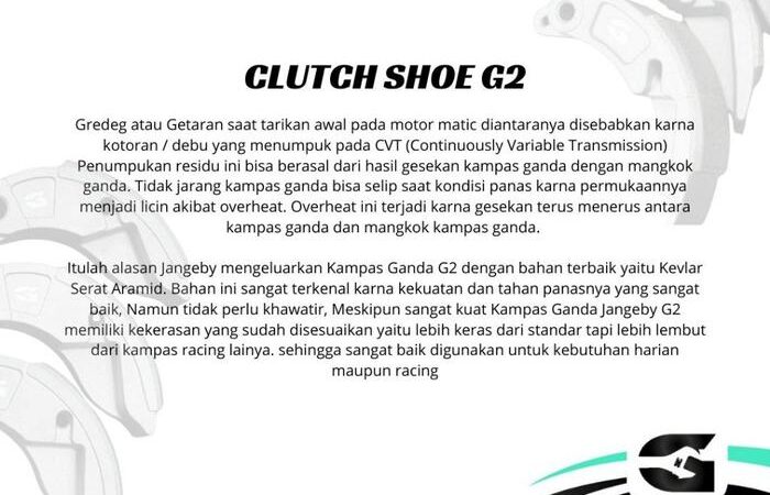 Tuntut performa maksimal dari motor matic Anda. Kampas Ganda Jangeby G2 dirancang khusus untuk mengatasi masalah umum seperti gredeg (getaran pada tarikan awal) dan selip akibat panas berlebih. Material Kevlar Serat Aramid yang kami gunakan menjamin daya cengkram kuat, tahan terhadap suhu tinggi, dan lebih awet.