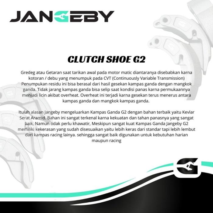 Tuntut performa maksimal dari motor matic Anda. Kampas Ganda Jangeby G2 dirancang khusus untuk mengatasi masalah umum seperti gredeg (getaran pada tarikan awal) dan selip akibat panas berlebih. Material Kevlar Serat Aramid yang kami gunakan menjamin daya cengkram kuat, tahan terhadap suhu tinggi, dan lebih awet.