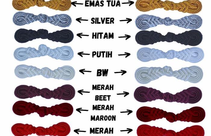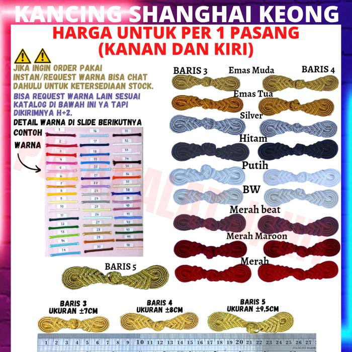 - Kancing Shanghai Keong: Jenis kancing panjang khas Tionghoa yang biasanya terbuat dari logam dan dihias dengan motif atau warna tradisional, digunakan untuk busana formal seperti Cheongsam atau baju Imlek.