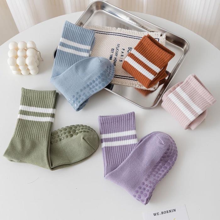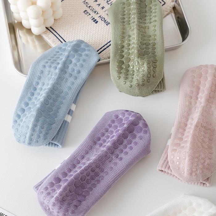 - Dot Grip: Pola berbentuk bulat (dot) yang terdapat pada sol kaos kaki, terbuat dari bahan khusus yang meningkatkan gesekan antara kaki dan permukaan matras, sehingga mencegah slip.
