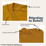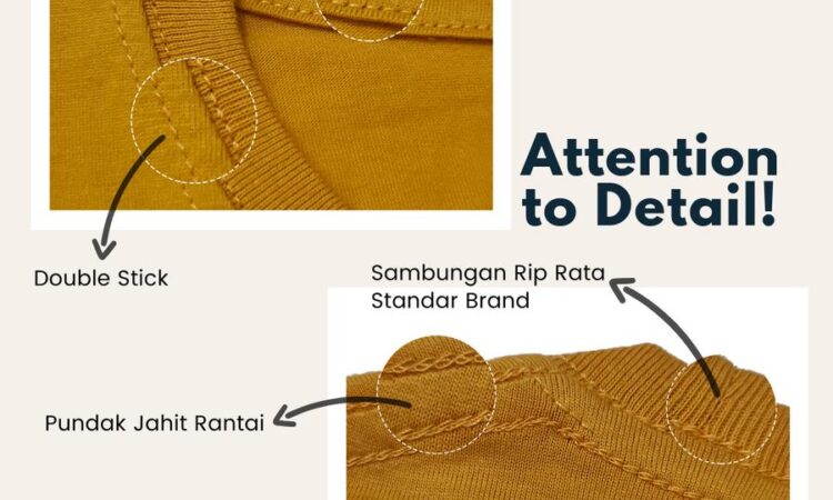 - RIB 1×1: Teknik rajut pinggiran kaos dengan perbandingan 1 benang atas dan 1 benang bawah untuk elastisitas.